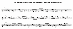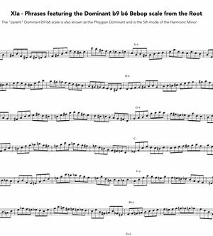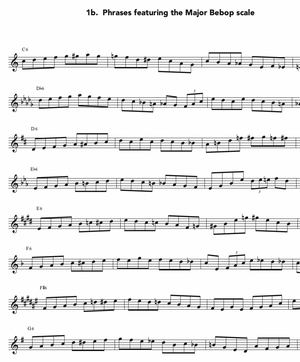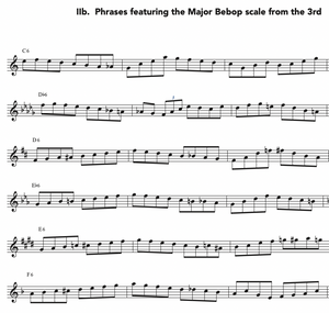 After each Scale class/ category (in 12 keys) you will find the specially written phrases in 12 keys that highlight the unique sound of each Bebop scale. (600+ in total)