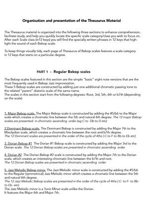 "The Thesaurus of Bebop scales is unique as it is the only publication in existence that provides the serious Jazz student with a reference guide of the the most essential Bebop scales all in one place in 12 keys"