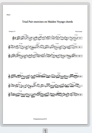 The PDF contains the carefully crafted lines demonstrated in the Youtube video that feature the triad pairs in different groupings of 3, 4, 5 and 6 notes bring out the sound of each chord.
