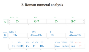 b) Roman numeral analysis grid- so you can understand the harmony and play in